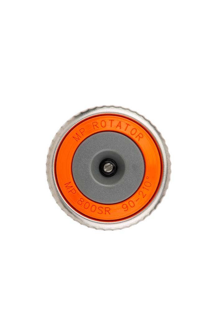 Bocal Multijato MP800 SR Hunter com arco de 90-210° e raio de 1,8 a 3,5 metros. Oferece taxa de precipitação de 20 mm/hr, alta eficiência, e resistência ao vento. Ideal para modernizações em sistemas de pulverização e espaços pequenos.