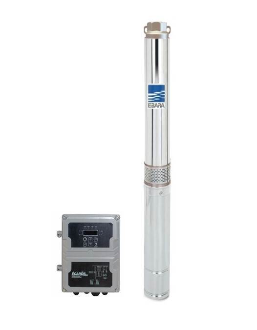 Bomba solar submersa EBARA 3SBPS2-10 CE 600W 48V, equipada com motor de ímã permanente sem escovas e controlador externo com MPPT. Ideal para poços de 3", irrigação, abastecimento rural e sistemas off-grid.