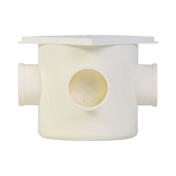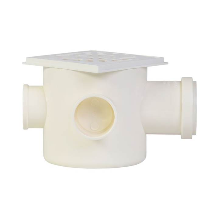 é ideal para coleta de águas de lavação e resíduos de grandes áreas. Inclui três entradas DN 40 e uma saída DN 50, com grelha redonda branca e porta-grelha.