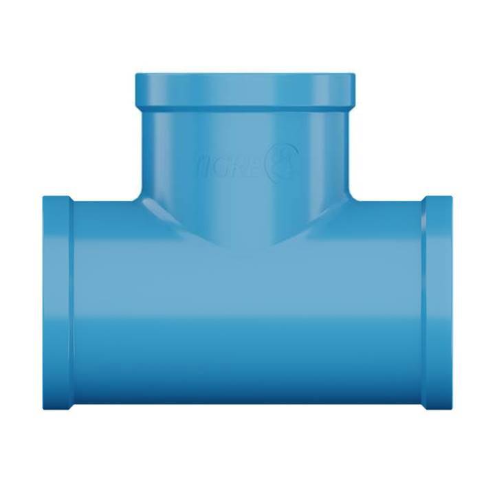 Tê Soldável DN35 Irriga Tigre em PVC azul. Resistente a produtos químicos e ideal para fertirrigação. Instalação simples com junta soldável.