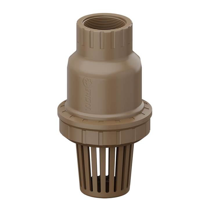 Válvula PE DN1.1/4 marrom Tigre. Ideal para manter o tubo de sucção cheio, reduzindo a escorva da bomba em sistemas hidráulicos residenciais e industriais.